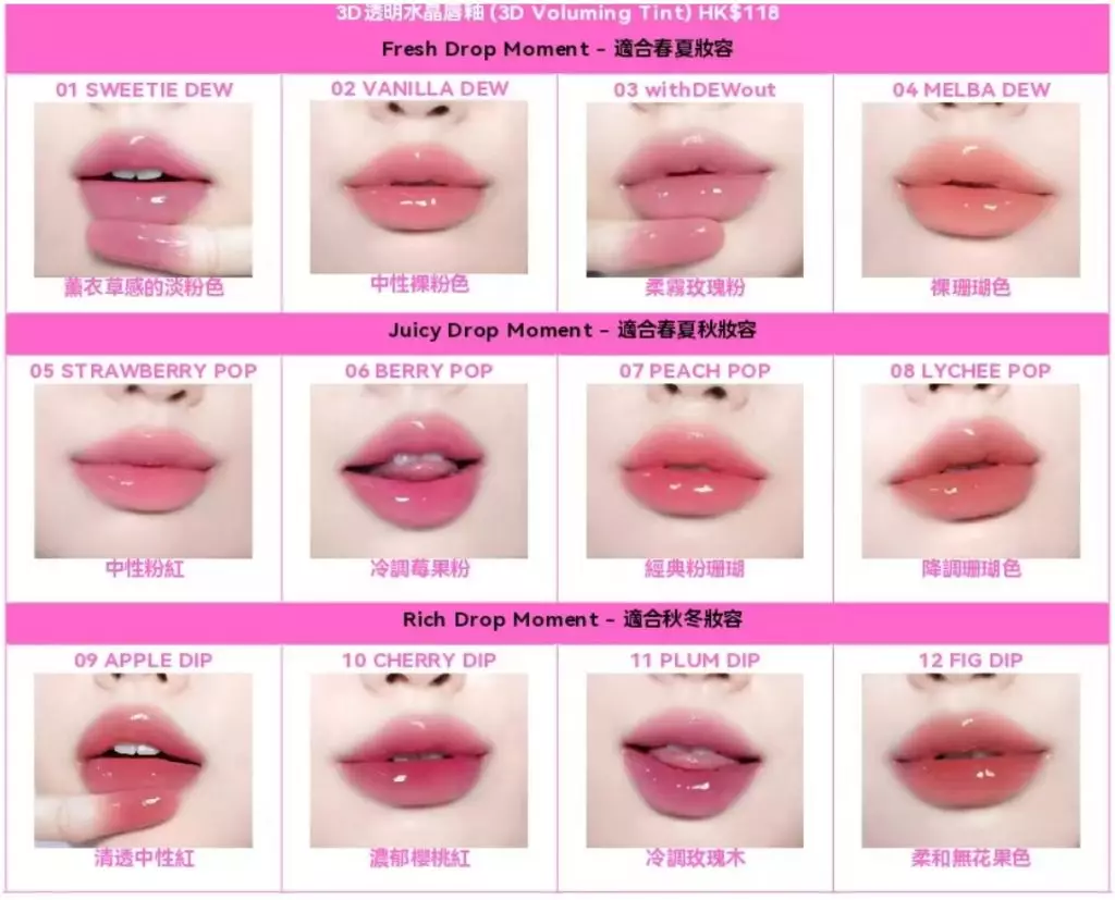 fwee其一皇牌產品——3D透明水晶唇彩,以極致光澤與豐盈厚度著稱,打造明亮飽滿的水晶唇妝,是韓妹化妝袋必收之物。由3月6日起,全新推出的 3D透明水晶唇釉 (3D Voluming Tint),延續3D唇彩的鏡面光澤,使用雙重植物來源複合配方深層滋潤雙唇,內含低分子膠原蛋白,一抹即感柔滑細緻,從早到晚持續保濕滋潤。質感介於高保濕唇蜜與輕盈唇釉之間,不黏膩且能柔和修飾唇紋,呈現立體飽滿的「水晶唇」效果。其染唇力也不欲,顯色持久不易脫色,全天候維持豐盈立體的唇妝。全系列共12款色號,分為 Fresh Drop Moment (清新桃子色調)、Juicy Drop Moment(甜美草莓調)及Rich Drop Moment(濃郁櫻桃調) 三大色系,滿足不同場合妝容。
