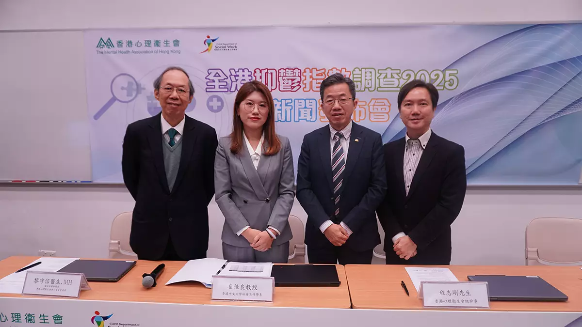 香港心理衛生會聯同香港中文大學舉行第七屆「全港抑鬱指數調查」新聞發佈會。(左起)香港心理衞生會執行委員會委員及精神科專科醫生黎守信醫生、中大社會工作學系崔佳良教授、香港心理衞生會總幹事程志剛、以及香港心理衞生會副總幹事黃敏信