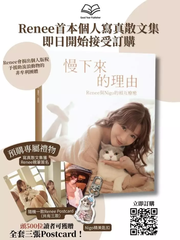 除了感情甜蜜外,Renee在事業上最近亦迎來新突破——推出個人寫真散文集《慢下來的理由》。有趣的是,她曾在入行初期多次拒絕經理人公司及攝影師邀請出寫真,原因是對自己外貌和身形欠缺自信,擔心只為迎合市場而強行出作品,連自己都不滿意之下,「點解人哋要買?」直到近年有出版社再度接觸她時,本來她一聽到「出書」就條件反射聯想到「寫真」,立即婉拒,直至對方提出「不如同你隻貓一齊出」,並表示非常欣賞她在網上分享與愛貓的互動,才成功打動她的心。Renee坦言,當知道可以用文字和照片記錄與愛貓的故事時,反而第一次對「出書」這件事感到期待,從單純賣樣子變成留住回憶,完全改變了她對寫真的看法。