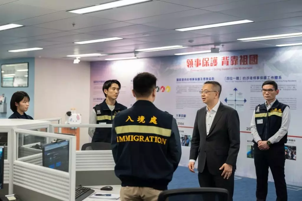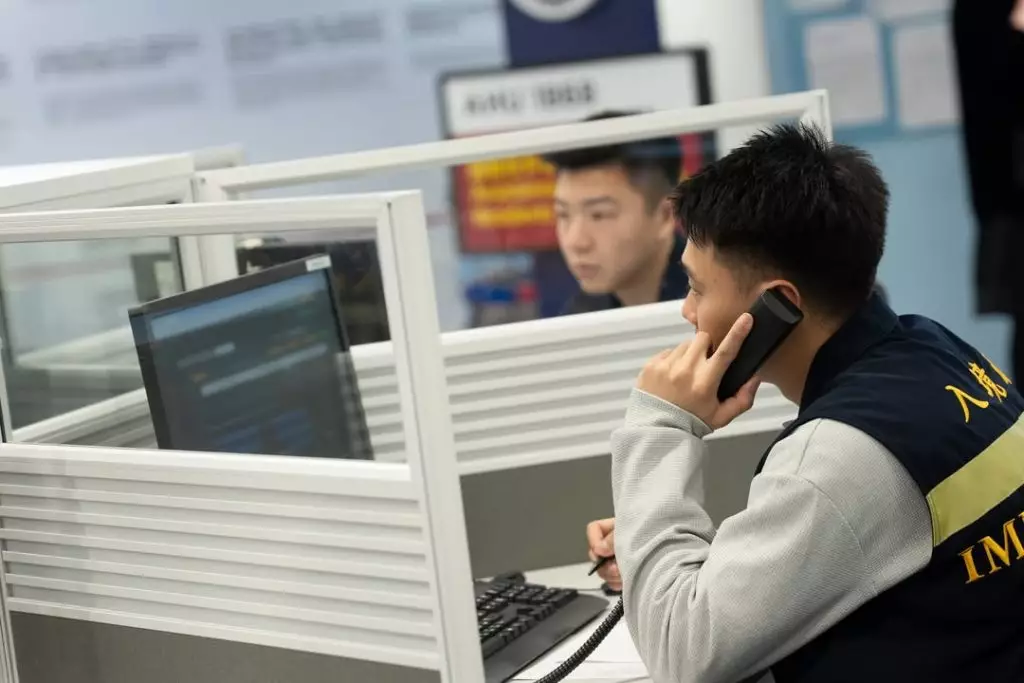 入境處處長郭俊峯到1868熱線中心視察及聽取匯報。IG圖片