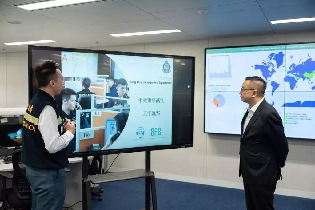 入境處處長郭俊峯到1868熱線中心視察及聽取匯報,並勉勵同事繼續努力,協助滯留港人盡快安全離開當地。入境處說,隨著部分中東國家的機場逐步恢復有限度運作,會繼續與受影響的港人保持聯絡,就航班與行程上提供意見,積極協助他們平安順利地回港。
