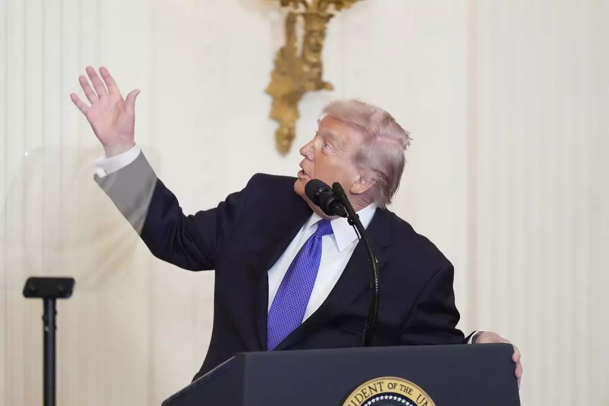 美國總統特朗普於2026年3月2日周一,在華盛頓白宮東廳出席榮譽勳章頒授儀式前,談及新舞廳的建設。(美聯社圖片/Alex Brandon) AP圖片