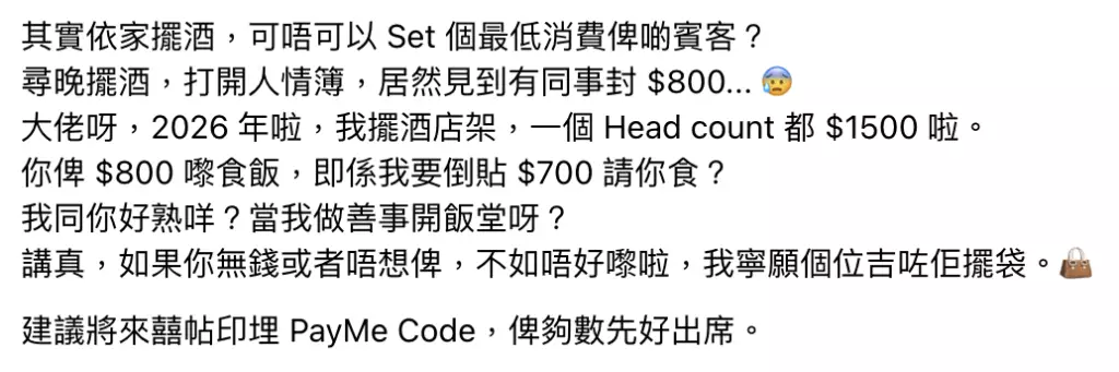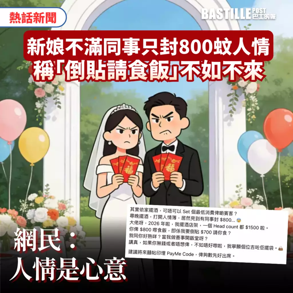 該新娘表示,日前於酒店擺酒,發現人情簿上有同事僅付800元。她直言「2026年啦,我擺酒店㗎,一個head count都1500啦。你畀800嚟食飯,即係我要倒貼$700請你食?我同你好熟咩?」。她更建議將來喜帖應印上支付二維碼,「畀夠數先好出席」,甚至問道:「其實而家擺酒,可唔可以set個最低消費畀啲賓客?」