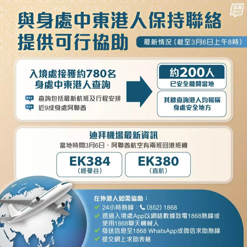根據迪拜機場最新資訊,當地時間3月6日,阿聯酋航空有兩班回港班機,分別為EK384(經曼谷)及EK380(直航)。此外,自迪拜機場有限度復航後,駐迪拜經貿辦人員協助當地港人理順離境安排,亦到場支援及協助港人,務求各人順利登機回港。商經局表示,其中包括一個一行9人的香港旅行團。駐迪拜經貿辦會繼續密切關注當地局勢,並向在迪拜的香港居民提供適切協助。