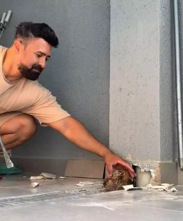 巴爾伯薩細心尋找聲源位置,發現聲音疑似來自牆角,遂用鎚仔及鑿子慢慢鑿開水泥牆。影片可見,他小心翼翼將牆壁鑿開,自家飼養的小貓也在一旁專注「監察」。隨著洞口逐漸擴大,被困在牆後的小貓頭鷹身影終於出現探頭而出。當時小貓頭鷹神情呆滯、模樣無助超惹人憐。