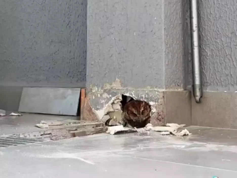 鑿開牆角驚見受困小貓頭鷹 無助模樣惹人憐