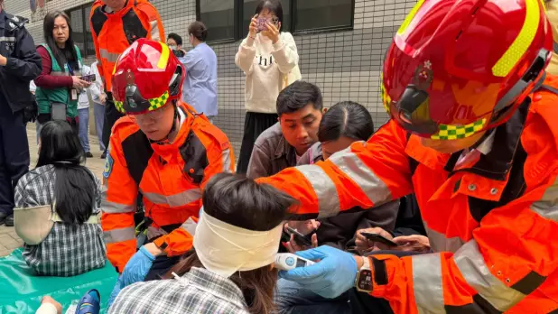 消防處在演習中派出無人機作高空監察,令救援人員能更清楚掌握全面的現場資訊。救護人員亦同步啟動「大量傷者事故檢傷分流系統」,即場為傷者進行分流及初步治理。