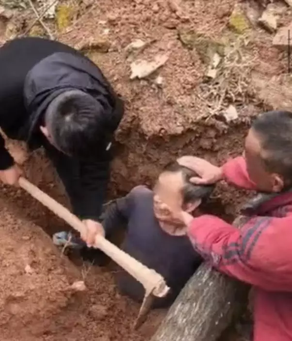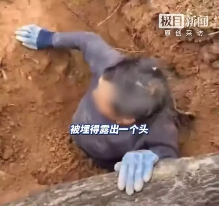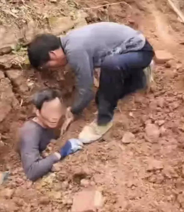 村民院壩挖地基遇塌方被埋只露頭部,獲鄰居合力挖土90分鐘脫困。影片截圖