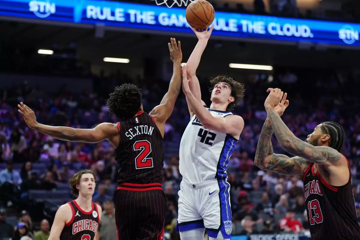 帝王隊中鋒雷諾(Maxime Raynaud)(42號)於公牛隊後衛塞克斯頓(Collin Sexton)(2號)頭上投籃。(美聯社圖片/艾倫格雷斯 Alan Greth) AP圖片