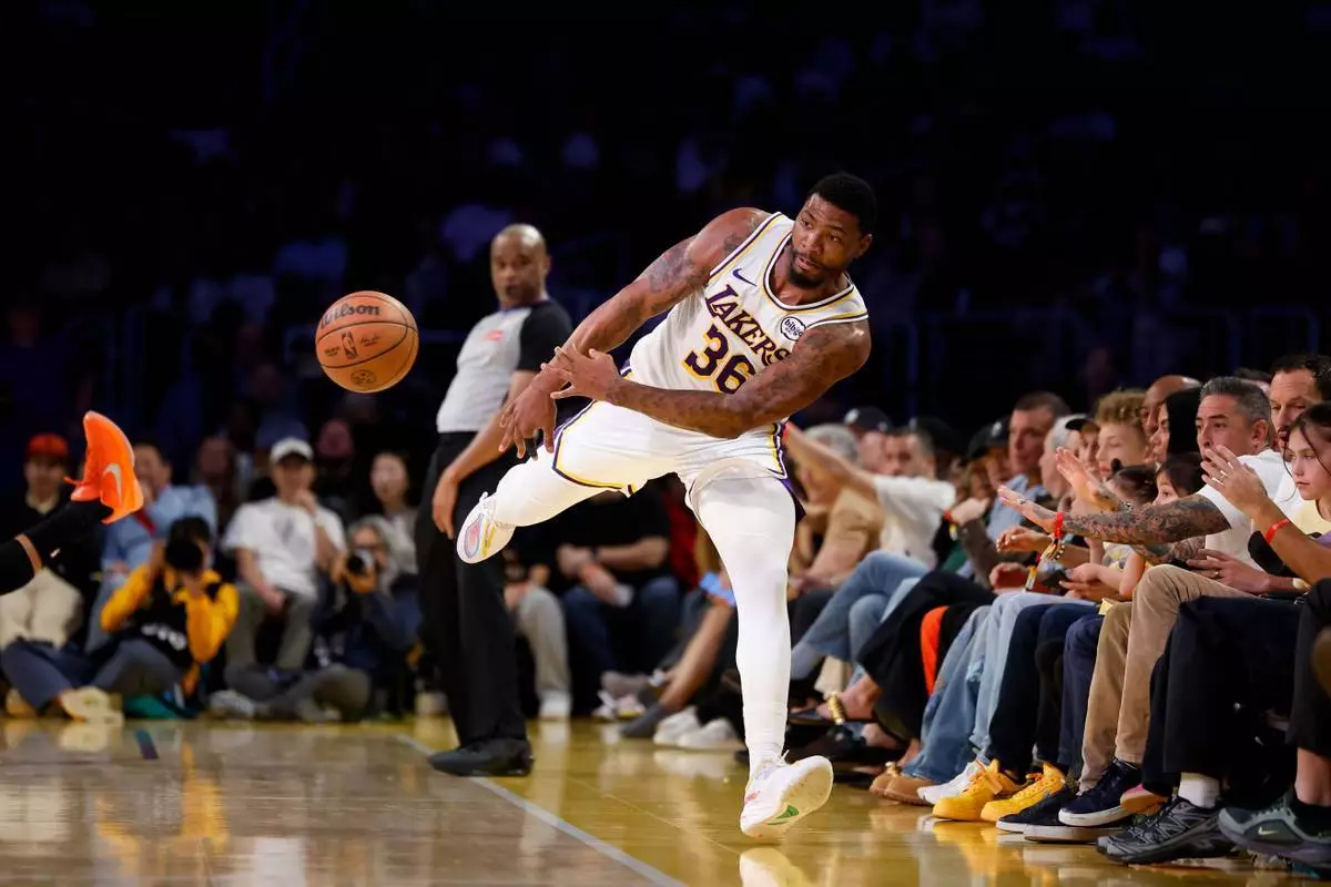 洛杉磯湖人後衛馬卡斯史馬特(Marcus Smart)(36號)阻止籃球出界。 AP圖片