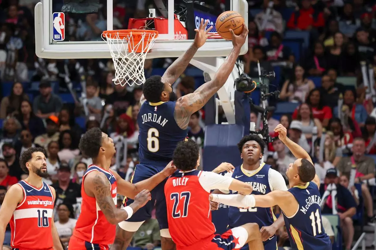 新奧爾良塘鵝中鋒迪安祖佐敦(6號)在2026年3月8日(周日)於新奧爾良舉行的一場NBA籃球賽上半場,在華盛頓巫師後衛韋爾萊利(27號)上方搶下防守籃板。(美聯社圖片/Peter Forest) AP圖片
