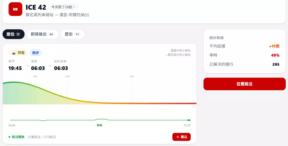 在所有列車中,一趟線路格外引人注意。連接科隆與柏林的ICE10目前是平台上被「押注」最多的列車,相關預測已經超過4550次。根據網站統計,用戶平均預測這趟列車會晚點約40.7分鐘。截至目前,平台上最高的一次虛擬收益為3506歐元(約3.1萬港幣)。