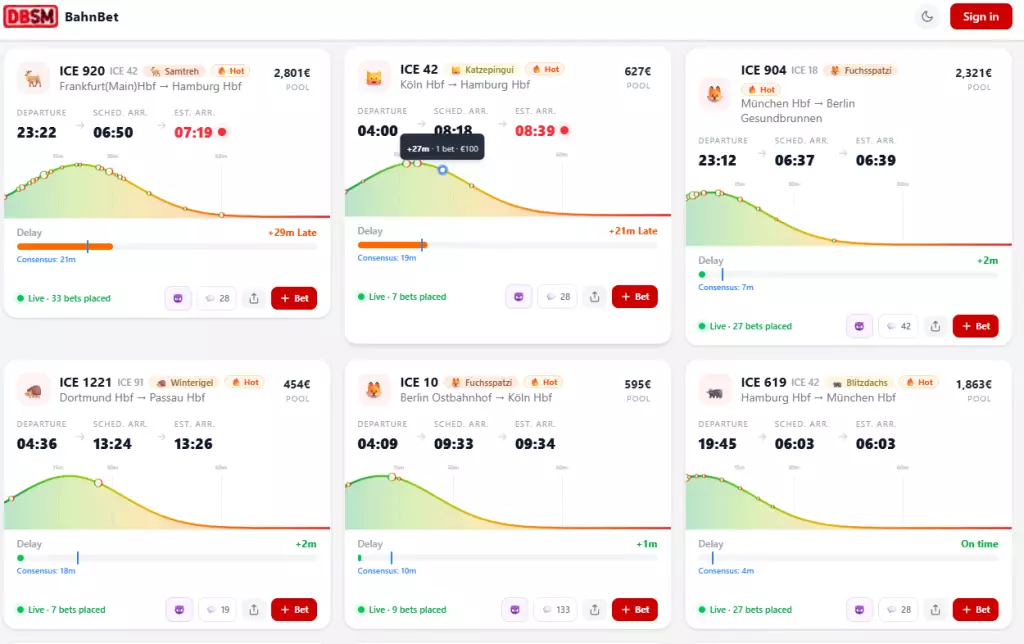 據外媒報道,網站名為「Bahn.bet」,與普通博彩平台十分相似。用戶可以選擇一趟具體的長途列車,然後預測它最終抵達目的地時的晚點時間,並投入虛擬資金進行「下注」。預測結果越接近真實晚點時間,獲得的「收益」就越高。整個介面和機制看起來幾乎和真實的賭博網站別無二致。