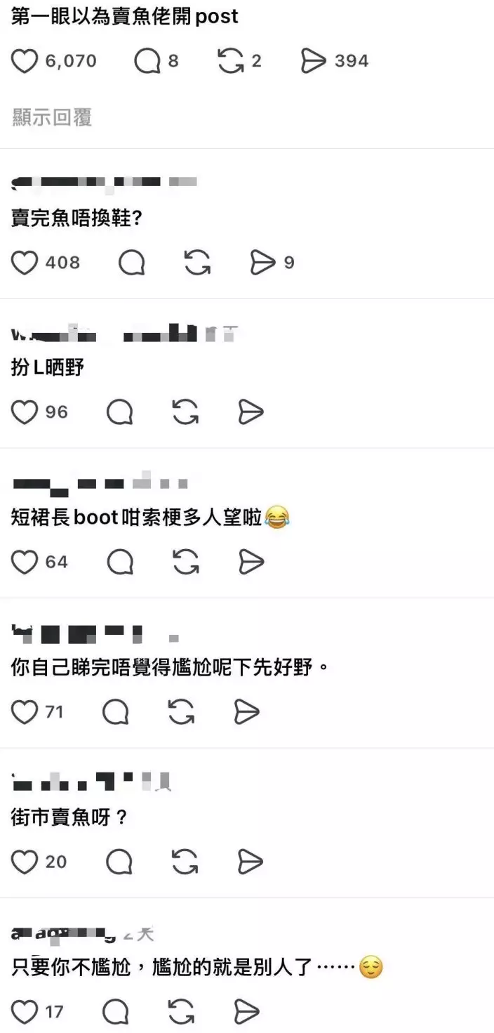 然而事件曝光後,網民反應兩極。有人同情其遭遇,但亦有不少人質疑她「扮嘢」搏關注,狠批:「妳專登嘅」、「淺色要著薄打底衫、打底裙,或者起碼你入面嘅內衣要全肉色」、「折射都睇到」、「唔好咁多幻想」。更有網民將焦點放在其長Boot上,搞笑留言:「街市賣魚呀?」、「賣完魚唔換鞋?」