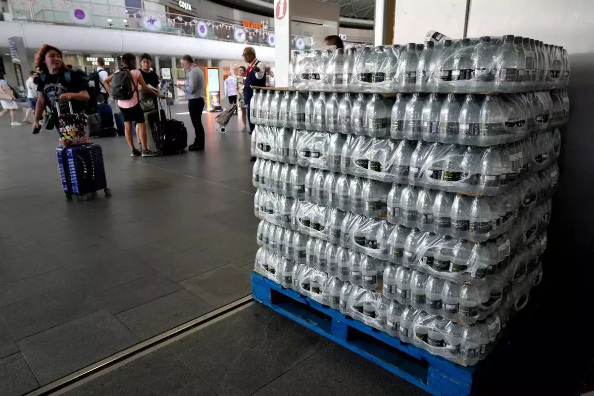 資料圖片:2022年7月19日,倫敦國王十字火車站(King's Cross railway station)因高溫導致列車取消,現場堆放瓶裝水供乘客取用。美聯社圖片/Kirsty Wigglesworth攝