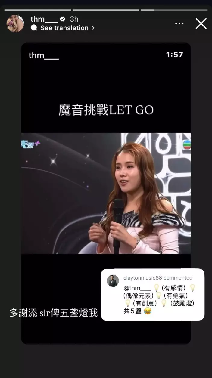 TVB全新選秀節目《魔音女團》日前進行面試,自稱「成家魔音」的「東張女神」鄧凱文憑自創《東張西望》版Rap成功突圍而出,影片引發熱議。其表現更吸引《中年好聲音》評判張佳添關注,事後在影片下留言:「加油!學唱歌可以搵我,最多優先俾你😂」鄧凱文追問獲幾多盞燈,添Sir搞笑列出「有感情、偶像元素、有勇氣、有創意、鼓勵燈」5盞燈,相當畀面!