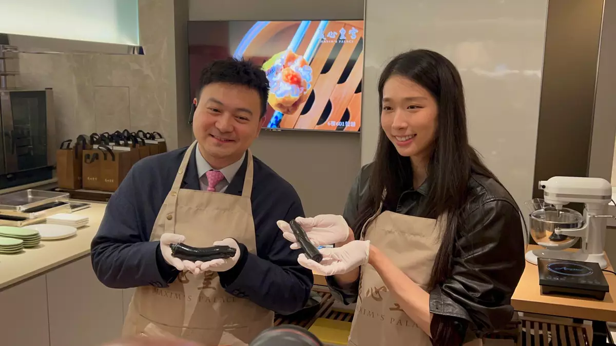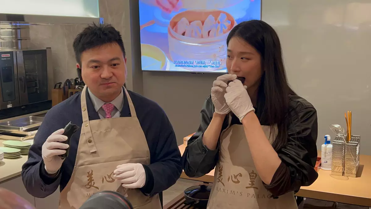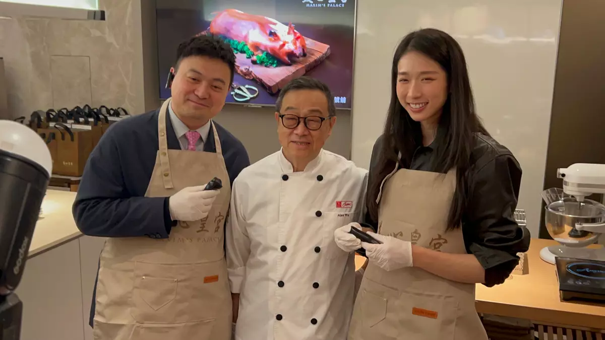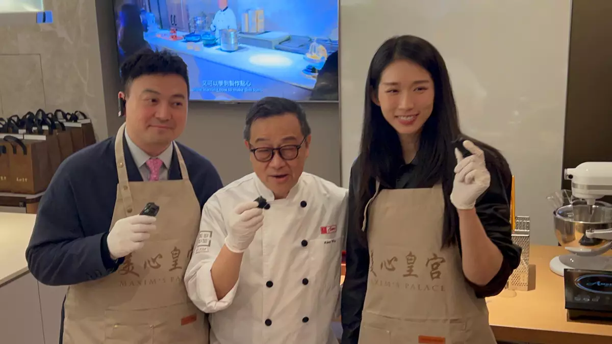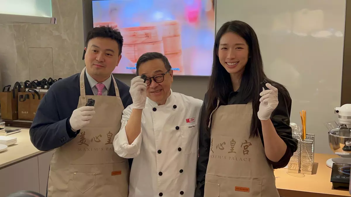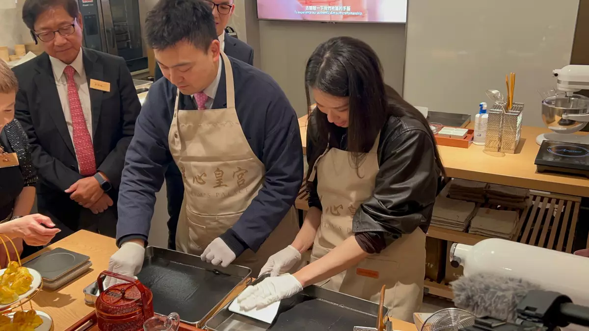 美心集團旗下中菜品牌「美心皇宮」第七間分店開幕,除保留傳統手推點心車,亦創新推出即燒乳豬、「美心點心教室」等,立法會議員江旻憓、梁進體驗製作芝麻卷,大讚「好好食」。