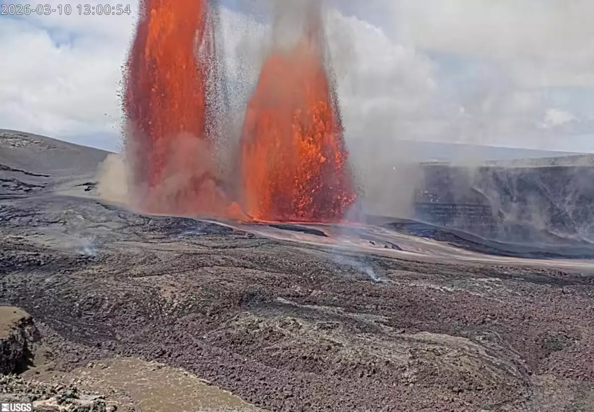 美國地質調查局(USGS)影片截圖顯示,夏威夷火山國家公園內的基拉韋厄火山於2026年3月10日周二噴發熔岩。 AP圖片
