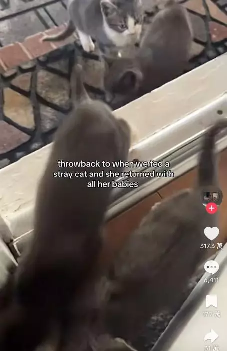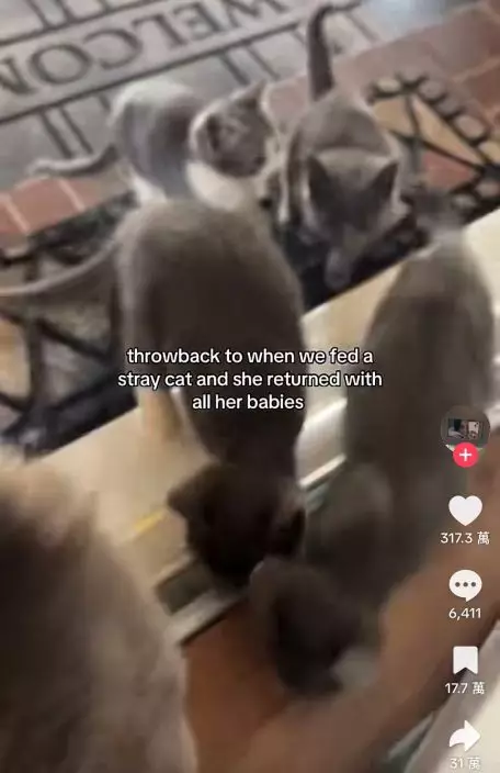 影片可見,當女子打開住所前門時,赫然發現早前曾餵過的流浪貓竟帶著多隻小貓守在門外。見女子現身後,貓媽媽與一眾小貓顯得相當安心,隨即跑進屋內,彷彿早已認定這裏是安全之所。
