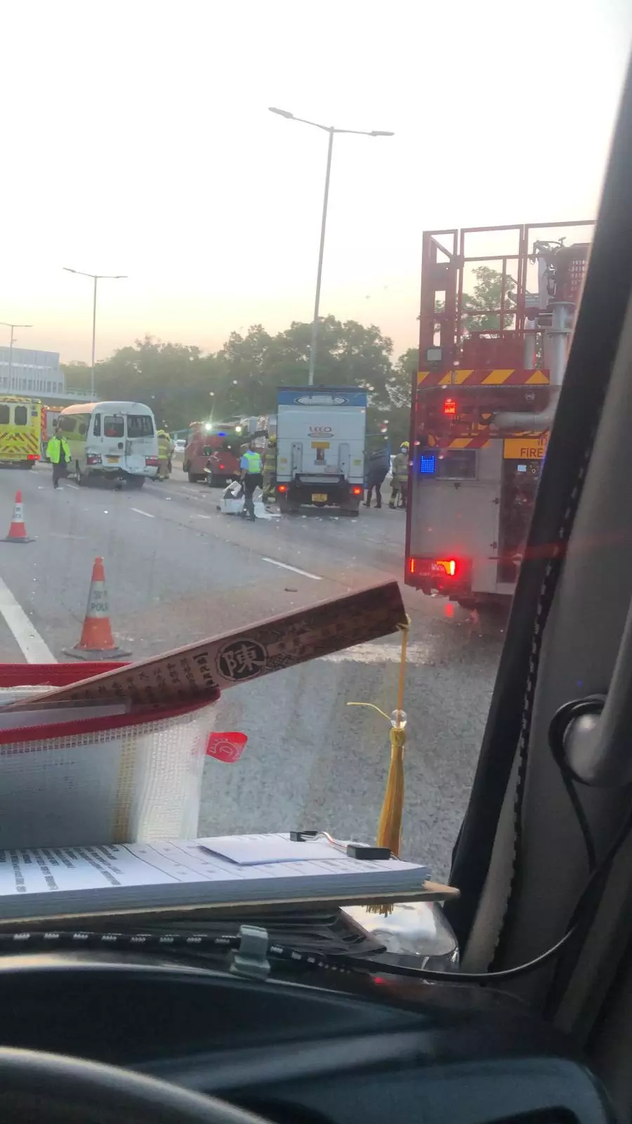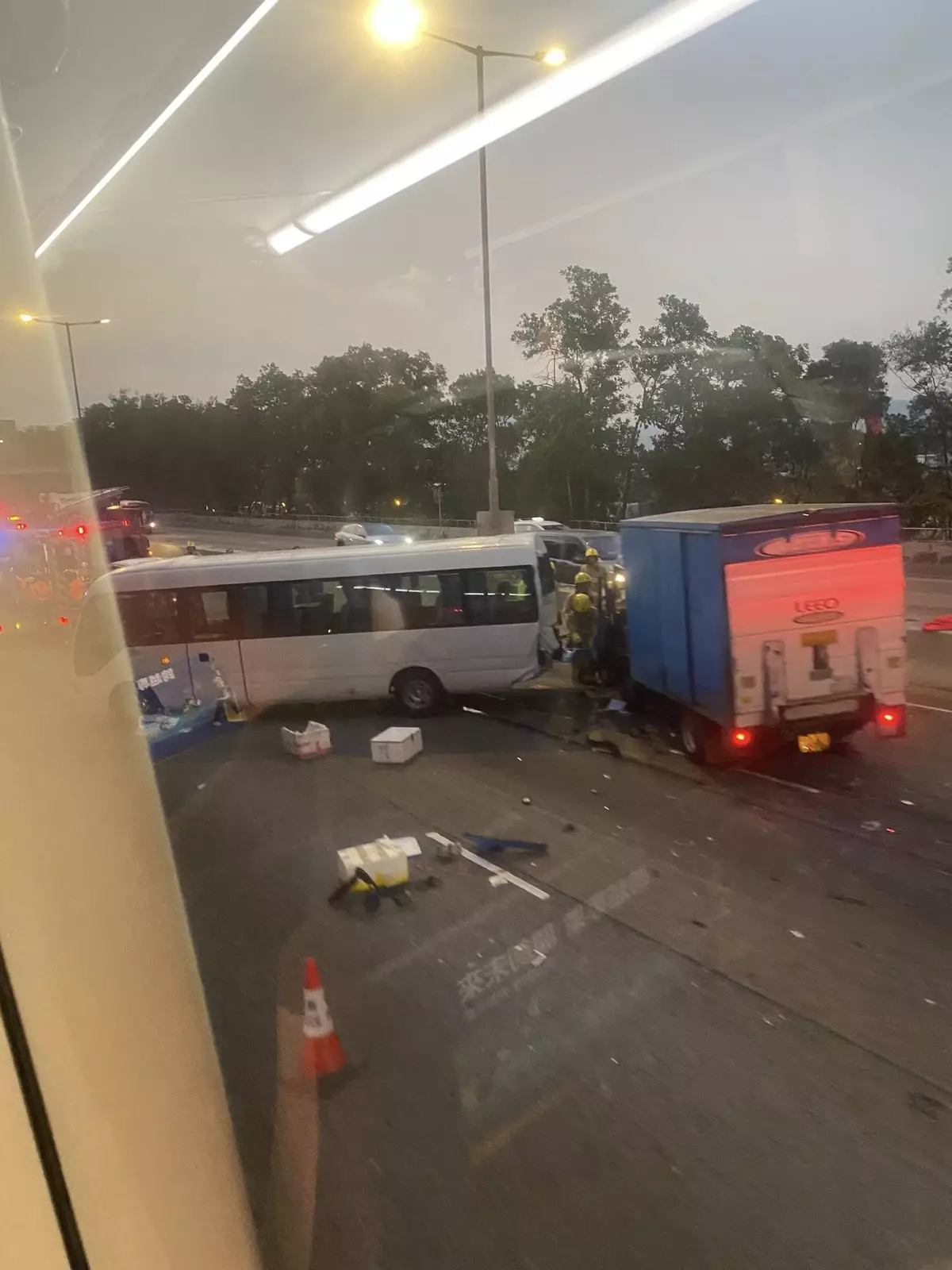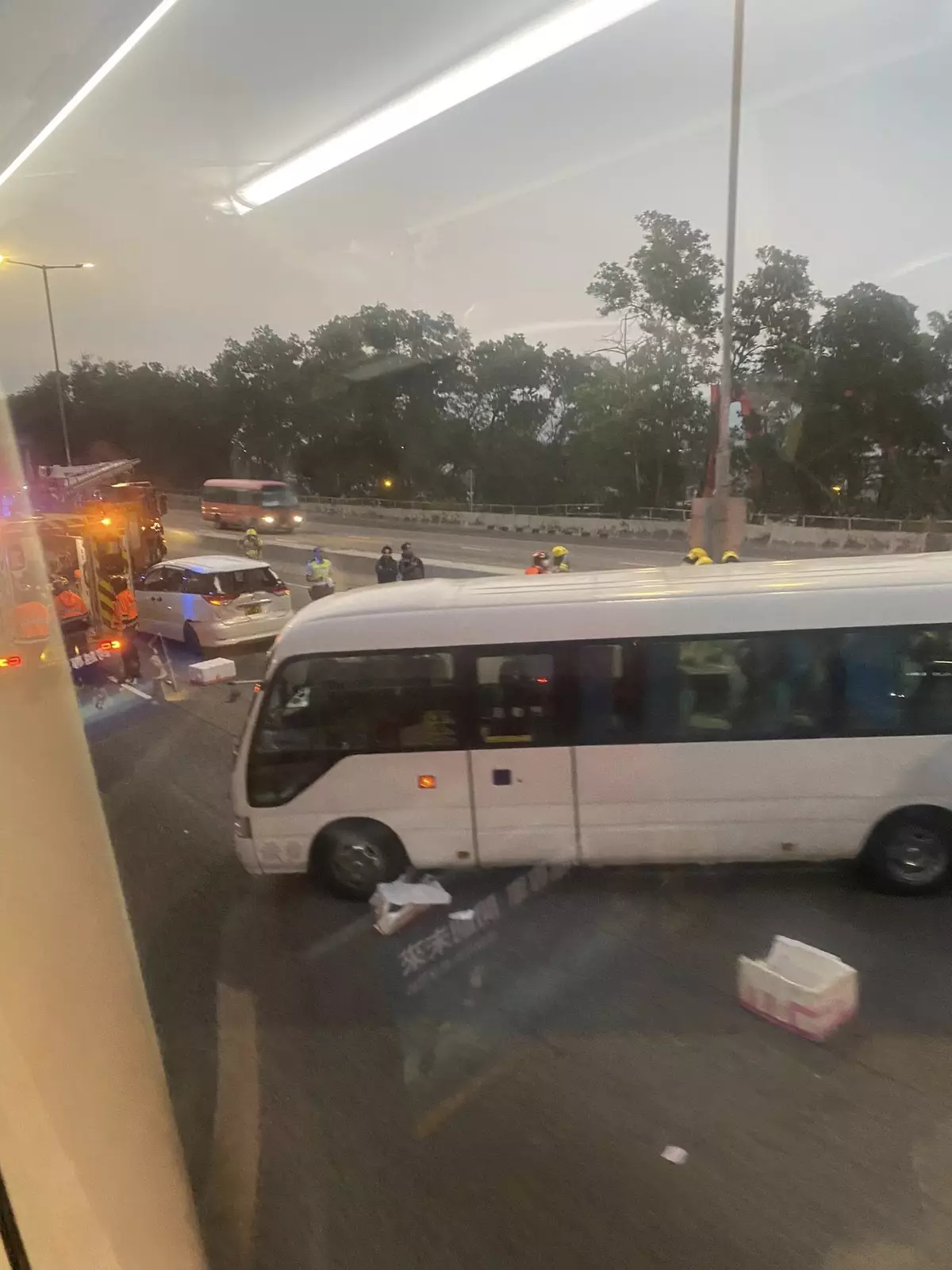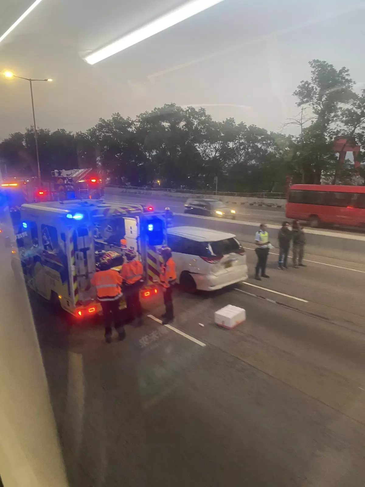 現場可見,其中一輛巴士擋風玻璃出現裂縫,車內遺留染血紙巾。亦有傷者腳部受傷,在救護車上接受治理。