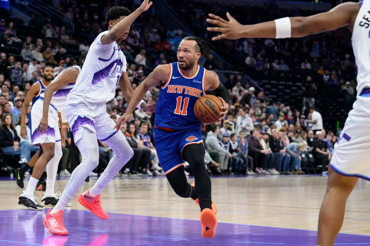 紐約人後衛般臣(Jalen Brunson,中)在猶他爵士後衛拜利(Ace Bailey,左中)防守下持球突破。 AP圖片