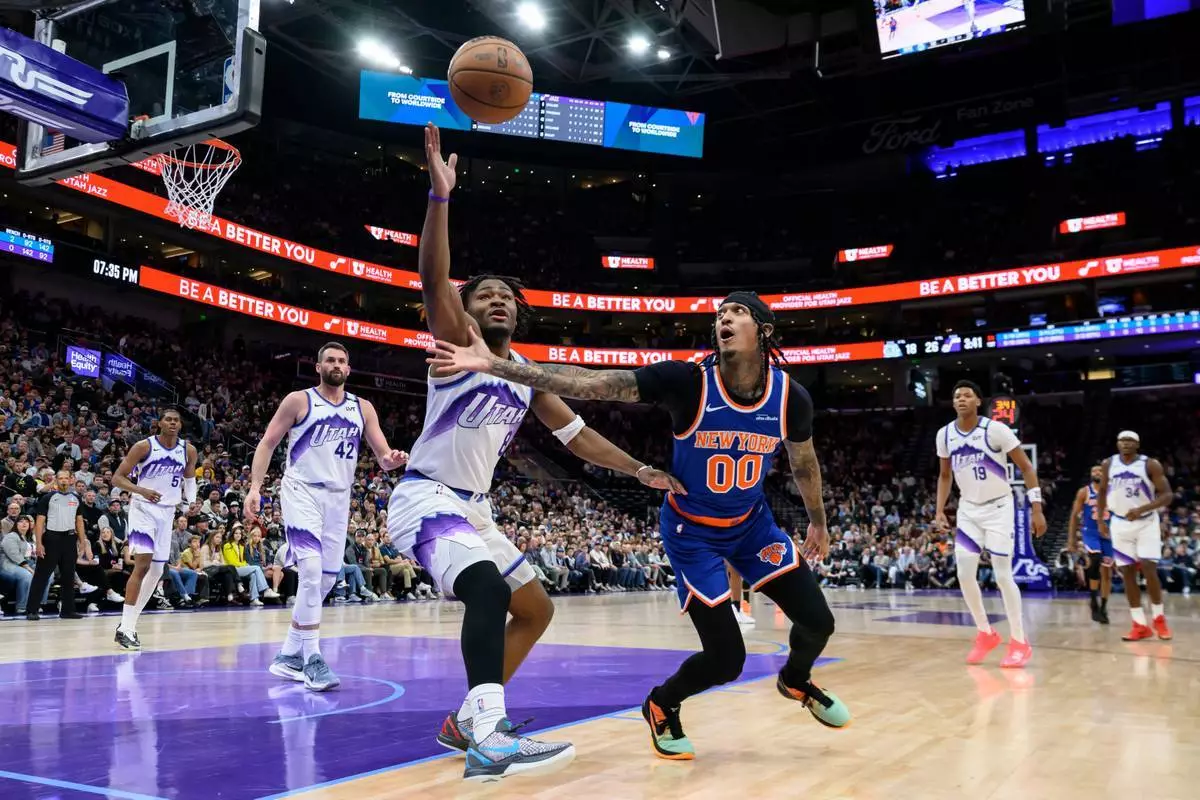 猶他爵士前鋒威廉斯(Cody Williams,左)與紐約人後衛般臣(Jalen Brunson,右)爭奪球權。 AP圖片