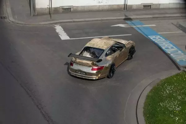 除了龜速外,這架保時捷也沒有引擎聲,外表看上去也怪怪的;望真啲,在車底好像露出了一對腳!原來這部土豪金保時捷的發明家,只是利用紙皮和金箔紙做車殼,而底盤卻是一部腳踏車。