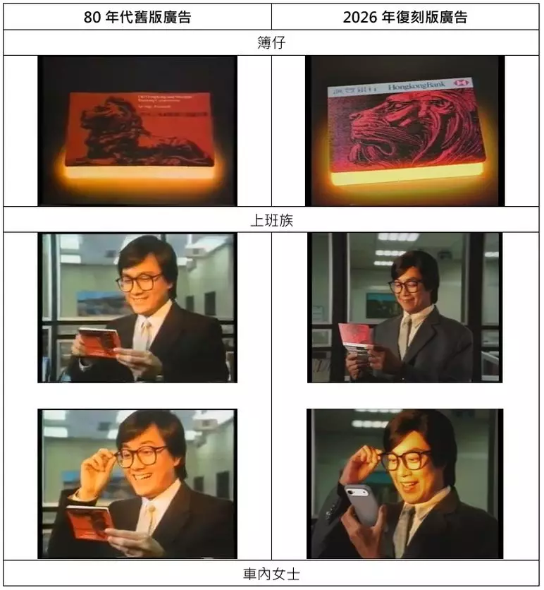 滙豐將經典「簿仔戶口」廣告完美復刻、逐格還原 由人造型、環境 佈置到字正腔圓的配音 都將當年光景細緻重現。配合復古色調及昔日電視機的4:3畫面比例帶領觀眾沉浸在往日時空之中。 「簿仔」於新廣告內打開時綻放出金光隨即化身為智能手機兼綻放更閃耀的光芒,象徵理財方式邁向數碼新世代 。由簿仔變成智能手機那份滿足感從此昇華。