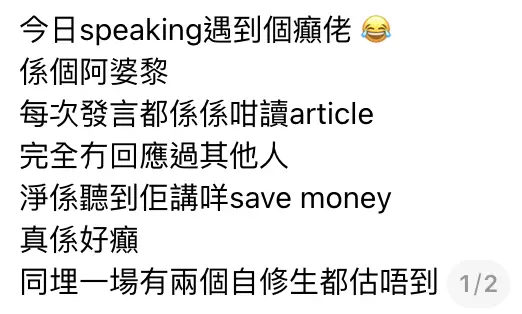 一名在油麻地拔萃女書院應考的女考生發文表示,遇到一名「阿婆級」考生,目測年齡約五、六十歲,滿頭白髮。她描述該長者考生「每次發言都係係咁讀article,完全冇回應過其他人」,全組只聽到她不間斷地重複「save money」一詞,令樓主直言「真係好癲」。