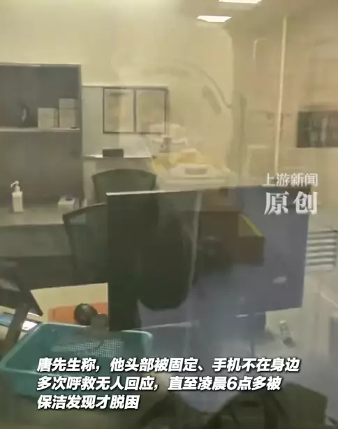 當日唐先生頭部被固定並戴上面罩,半小時後檢查完畢卻無人接應。他多次大喊「有人在機器上」,惟無人回應。因機器仍有運作聲,他不敢亂動,在狹窄空間受困至清晨6時,才由清潔工發現並協助脫困。
