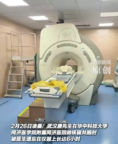 武漢唐先生2月26日凌晨於同濟醫院漢口院區接受核磁共振(MRI)檢查,期間被困機器內達6小時,直至清晨由清潔工發現才獲救。