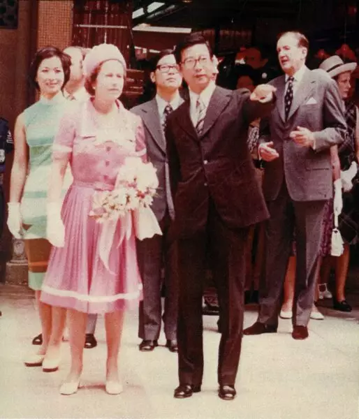 廖本懷於1975向到港的英女王伊利沙伯二世介紹當時的公共屋邨。港大建築學院圖片