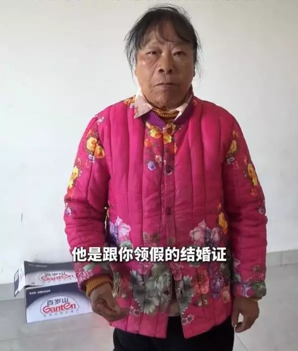 82歲老婦收下1000元人民幣現金加20隻雞蛋後被47歲男帶去領證誤以為開玩笑。影片截圖