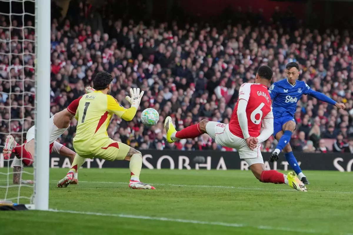 愛華頓球員迪韋麥尼爾在英格蘭倫敦舉行的英超聯賽中,對陣阿仙奴時射門。攝於2026年3月14日周六。AP圖片