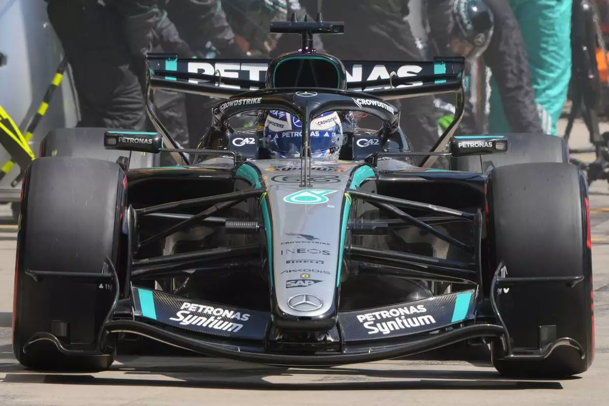 2026年3月14日周六,平治(Mercedes)英國車手佐治·羅素(George Russell)在中國上海國際賽車場舉行的一級方程式中國大獎賽衝刺賽期間駛出維修站。(美聯社圖片/Andy Wong, Pool) AP圖片