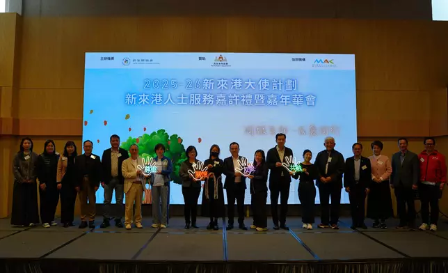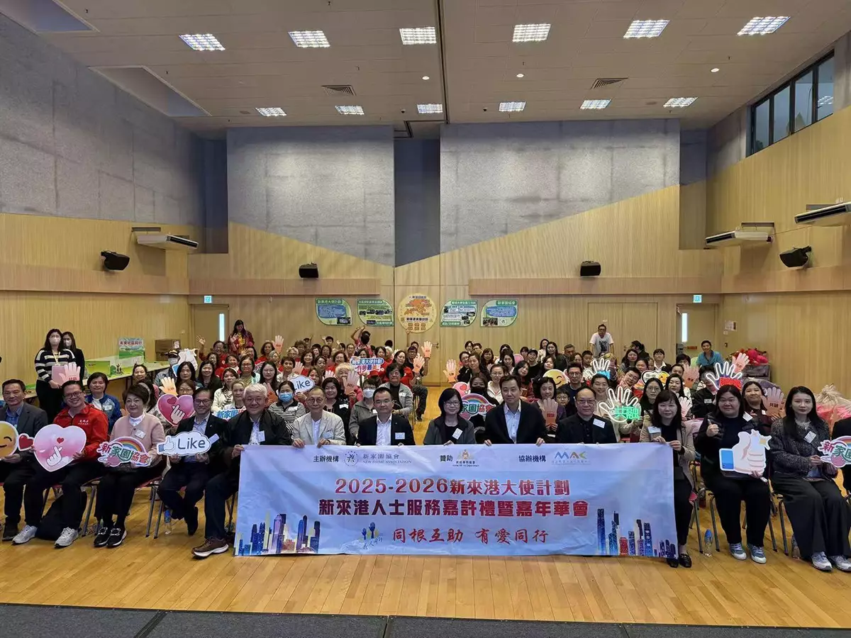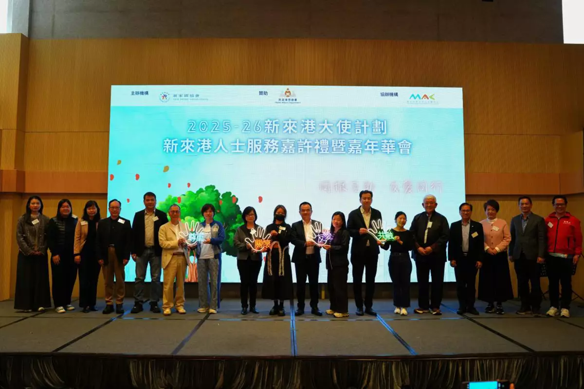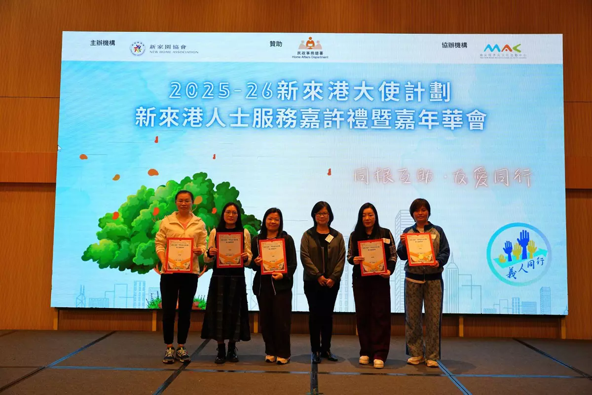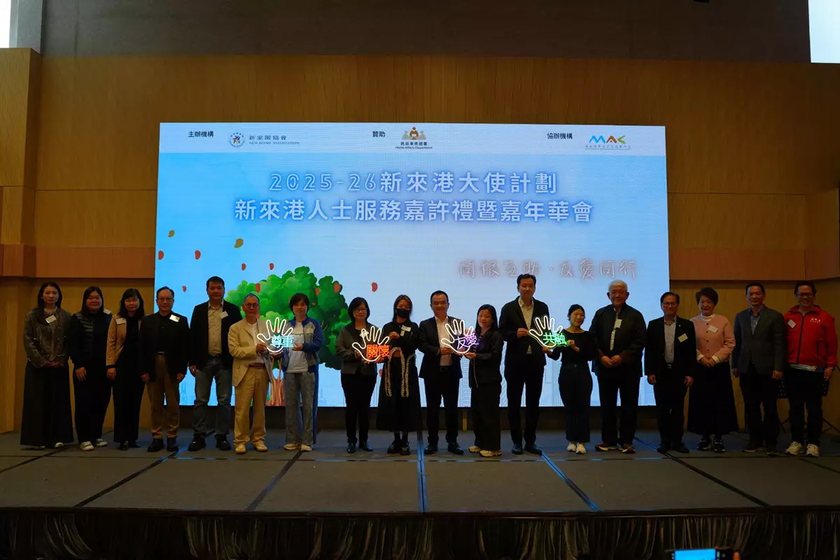 新家園協會星期六(3月14日)於油尖旺多元文化活動中心,舉辦「2025-2026年度新來港大使計劃大使義工嘉許禮暨嘉年華」,嘉許過去一年無私奉獻的56位關懷大使及義工。活動邀得民政事務總署總行政主任陳慧儀、中聯辦社工部劉惟杰、新家園顧問委員會主席梁祖彬教授及協會總幹事黃頌等主禮嘉賓蒞臨,共同見證並弘揚社區關懷與互助共融的精神。