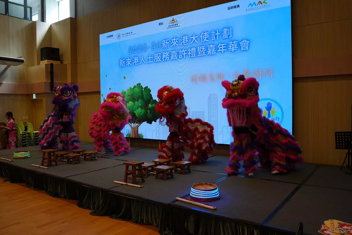 嘉許禮在坪石天主教小學舞獅隊的鼓聲中熱鬧開場。新家園協會總幹事黃頌致辭時表示,新來港大使計劃成果豐碩,令人自豪,衷心感謝各方的長期支持與付出。他又提到,國家「十五五」規劃開局為香港帶來新機遇,加上社會穩定宜居,預計將吸引更多人才來港發展。他呼籲更多有心人加入計劃,成為新來港朋友的「同行者」,共建友愛包容的社會。