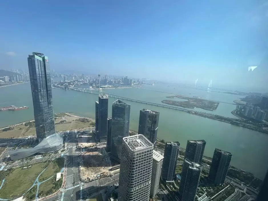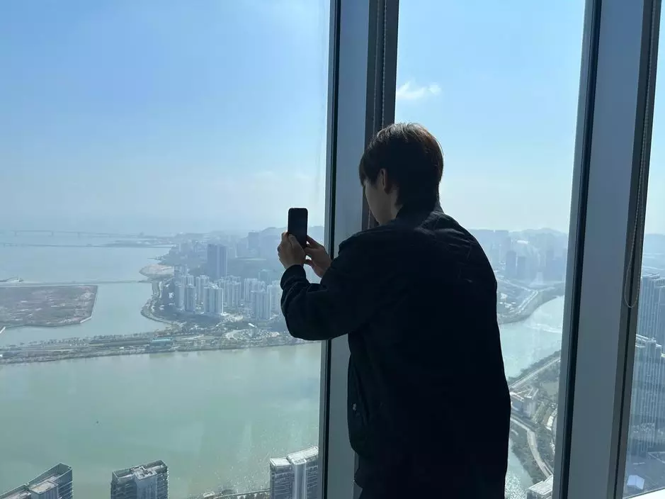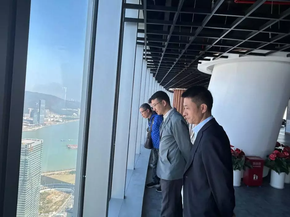 首站,團員們登上了中交匯通橫琴廣場的主塔樓展廳。在數百米高空,大家俯瞰橫琴島全貌,對岸澳門的旅遊塔、新葡京酒店等標誌性建築清晰可見。