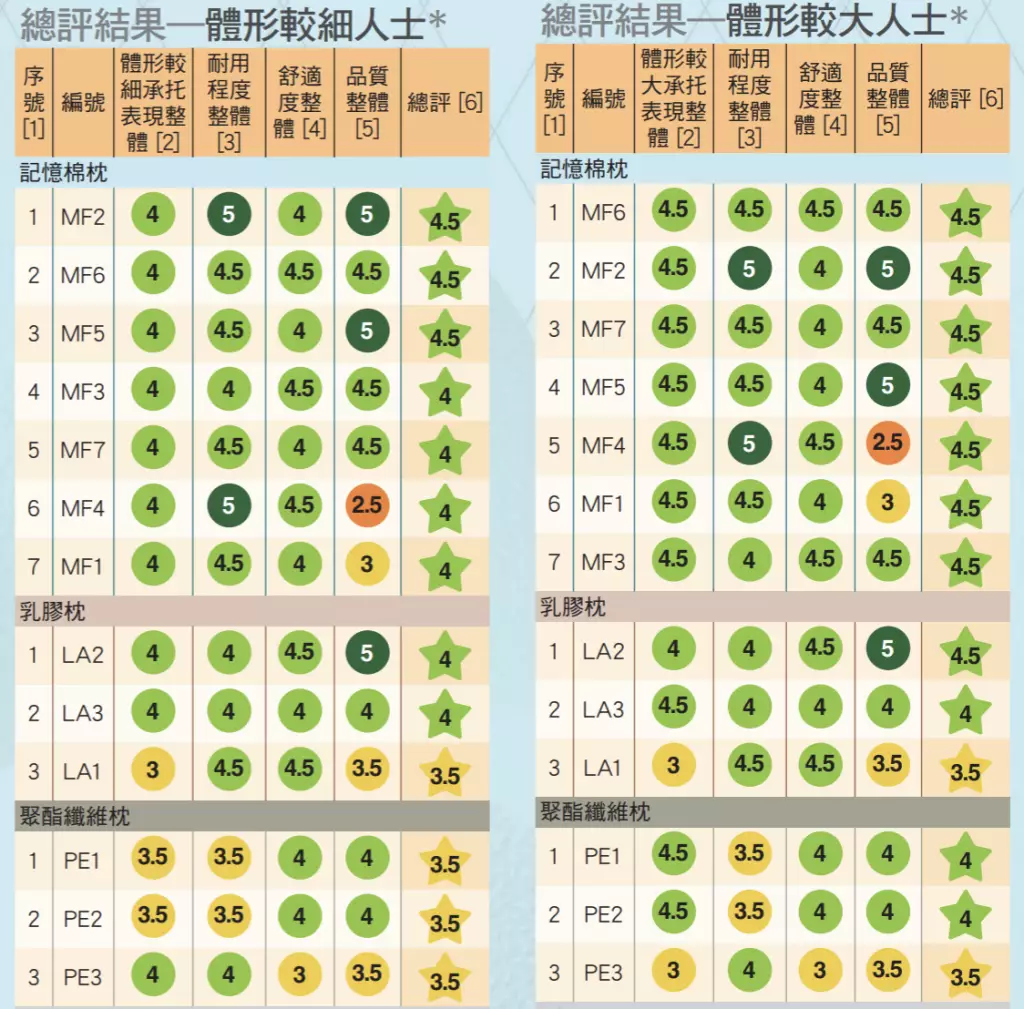 總體表現顯示,兩款售價僅99.9元、聲稱來源地為中國的BRUKSVARA 人體工學枕頭(MF1)和加滕 Kato 竹纖維記憶棉枕(MF4),與售價1688元、聲稱來源地為澳洲的Dentons Luxurious Support Pillow(MF3)等共十款枕頭,在體形較大人士測試都得到4.5分。