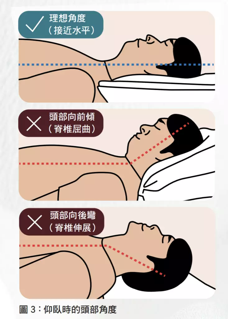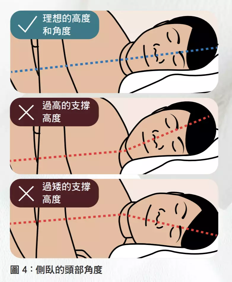- 仰睡時從側面看,頭部、頸部與胸部應在同一水平線;側睡時從正面看,面部、頸部與胸部應成一線