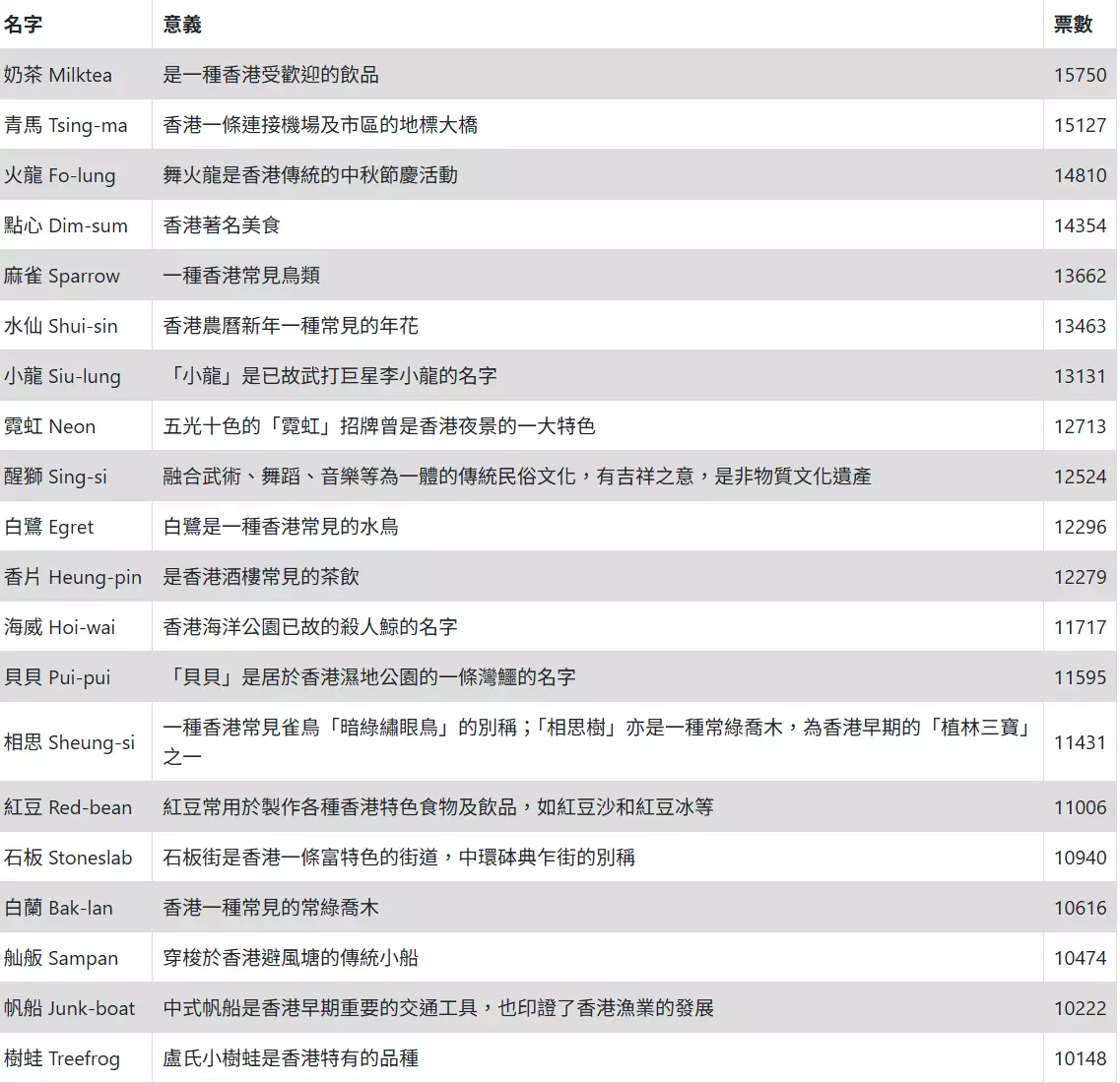 2023年熱帶氣旋名字網上投票結果。天文台網頁截圖