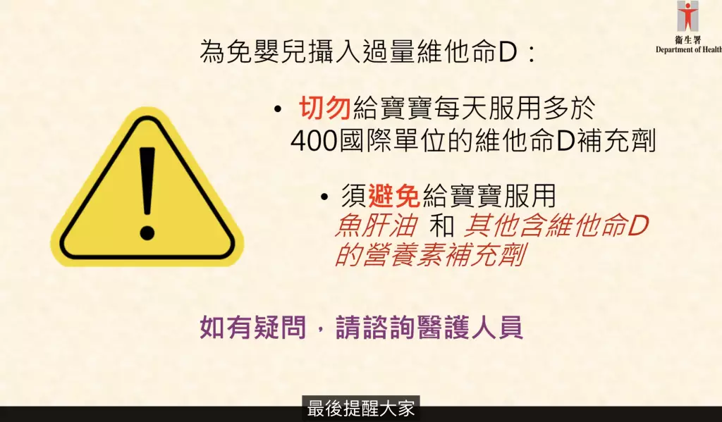 衞生署提醒家長和照顧者,應嚴格遵照建議劑量讓嬰兒服用維他命D補充劑,切勿過量或擅自調節劑量。發言人指出,若嬰兒長期攝取過量維他命D,出現不良健康反應的風險會相應提高。