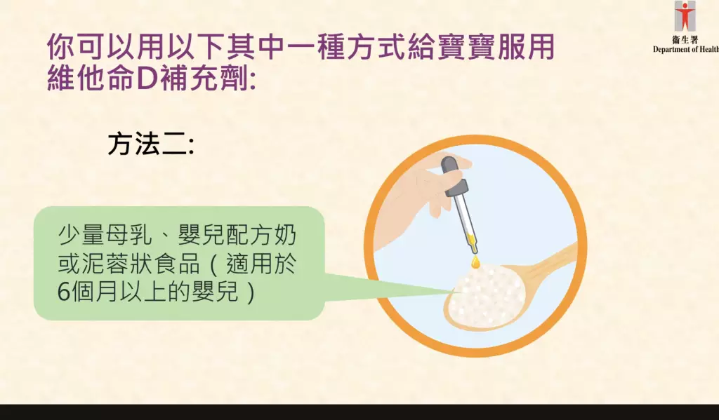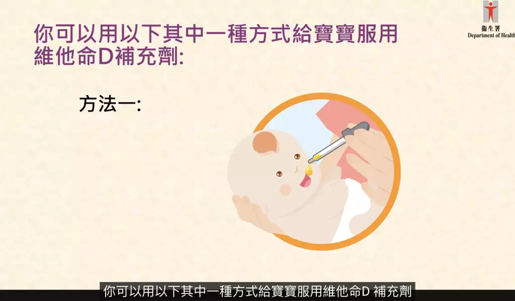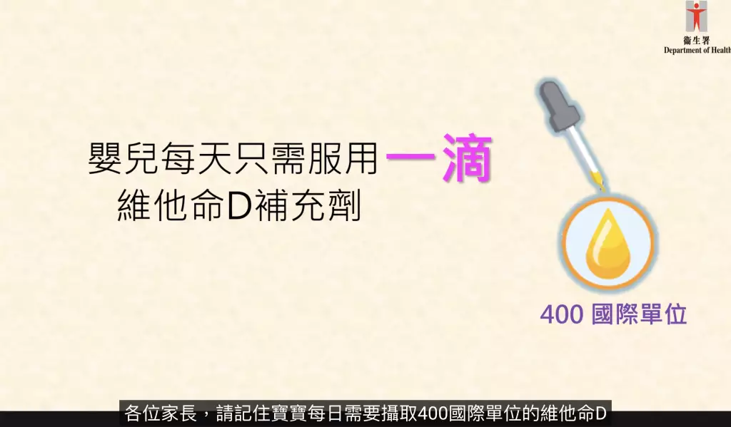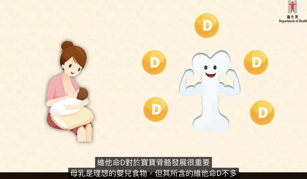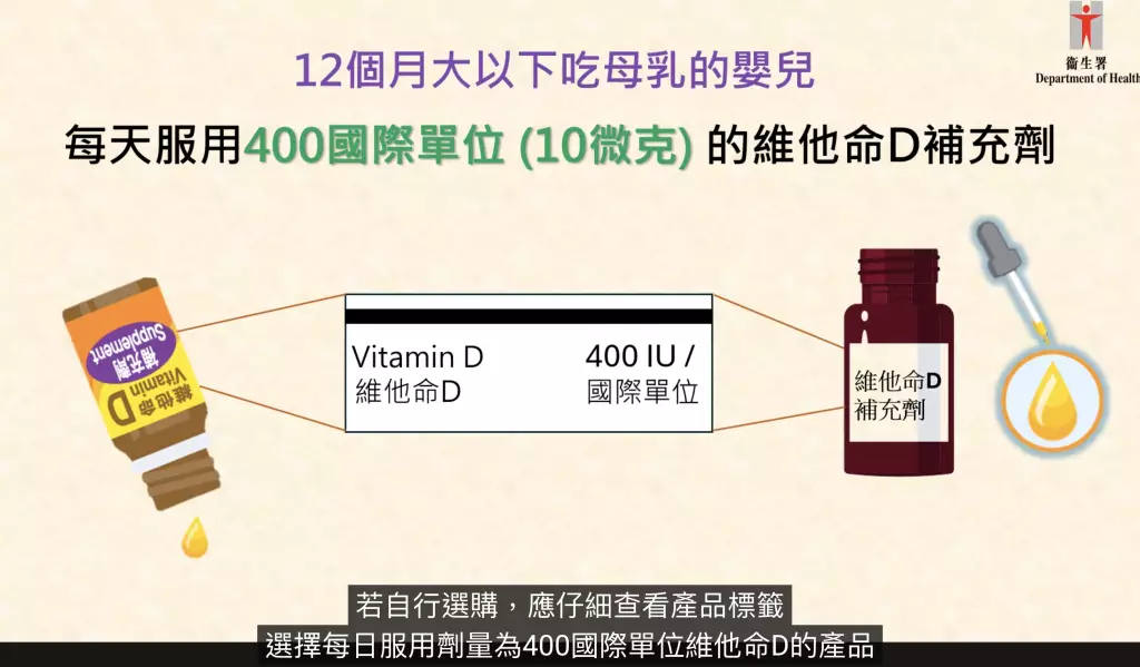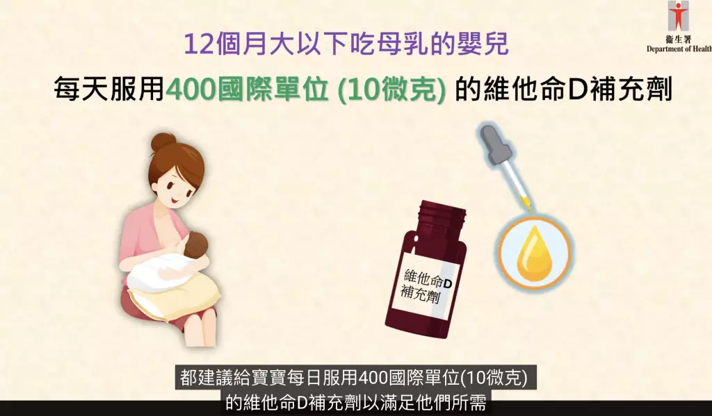 衞生署表示,母乳是嬰兒最理想的食物,但其所含的維他命D未必足夠滿足嬰兒需求。由於12個月大以下的嬰兒應避免直接照射陽光,為預防缺乏維他命D,署方專家工作小組建議,以母乳餵哺(包括全母乳及混合 餵哺)的嬰兒,由出生至12個月大,每天應服用400國際單位(10微克)的維他命D補充劑。
