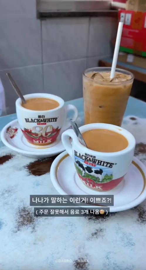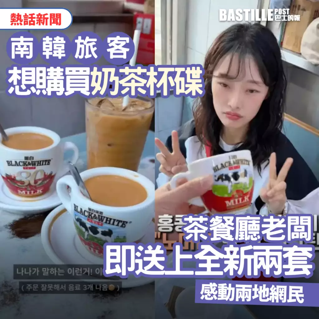 南韓旅遊頻道的Daero和Nana最近來港旅遊,他們隨即光顧下榻酒店附近的石塘咀摩登快餐廳,希望體驗香港地道的茶餐廳文化。在享用食物的時候,他們對盛載熱飲用的黑白淡奶茶杯和杯碟感到很有興趣,並詢問店員可否買走。但店員回覆指這些是非賣品。