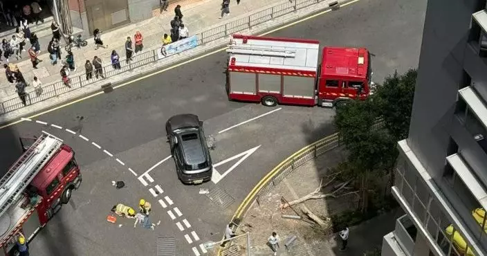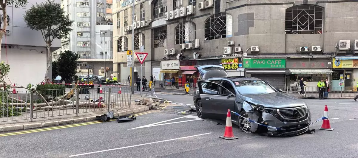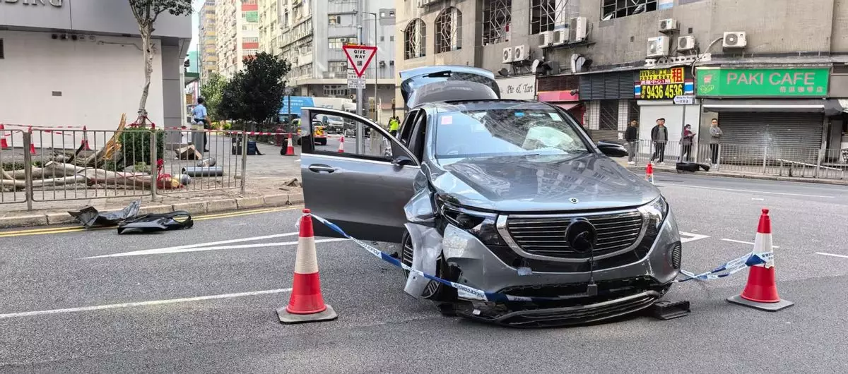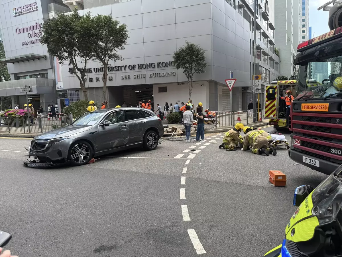 一部私家車在大棠路與裕景坊交界的安全島撞傷兩名男子。有線新聞影片截圖