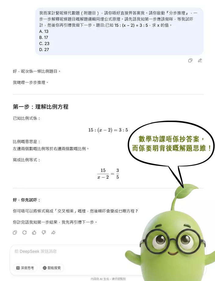 今日介紹嘅 DeepSeek,絕對係 2026 年理科生嘅神級救星!佢同其他 AI 唔同嘅地方,在於佢受過特別嘅「強化學習」訓練,擁有超強嘅數學邏輯同「思維鏈 (Chain of Thought)」能力 。佢解題嘅過程就好似人類思考咁,會將一條複雜嘅難題,自動拆解成幾個容易理解嘅小步驟 。