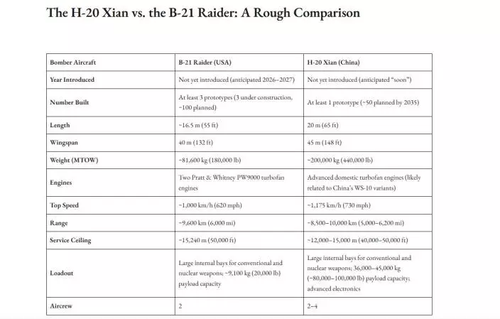 中美新型隱形轟炸機性能對比表顯示,轟-20在體型、最大起飛重量及載彈量等方面均具有顯著規模優勢。