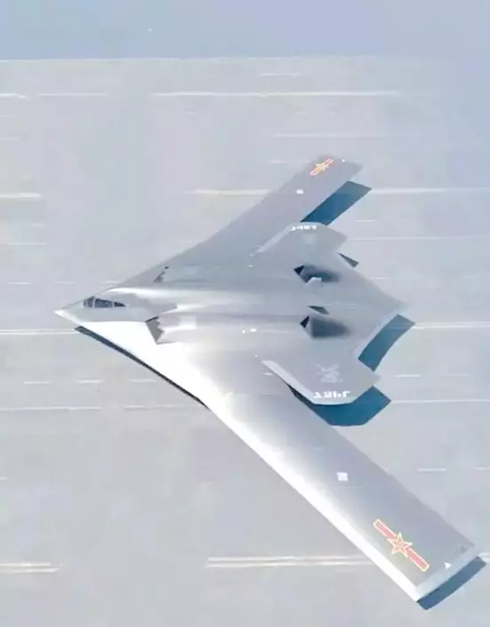 轟-20採用典型的大飛翼匿蹤佈局,翼尖帶有顯眼的低可偵測性軍徽,體現了中國空軍追求遠程隱身打擊能力的技術導向。