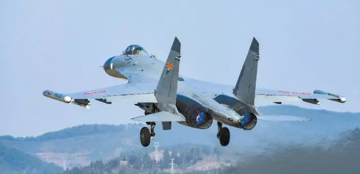 殲-16多用途戰鬥機掛載導彈升空,在聯合演習中模擬制空與對地攻擊任務。