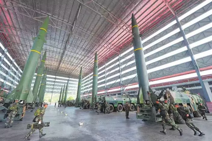 多枚東風系列彈道導彈在裝備庫內戰備列陣,導彈部隊官兵進行快速出動演練,檢驗戰備反應能力。